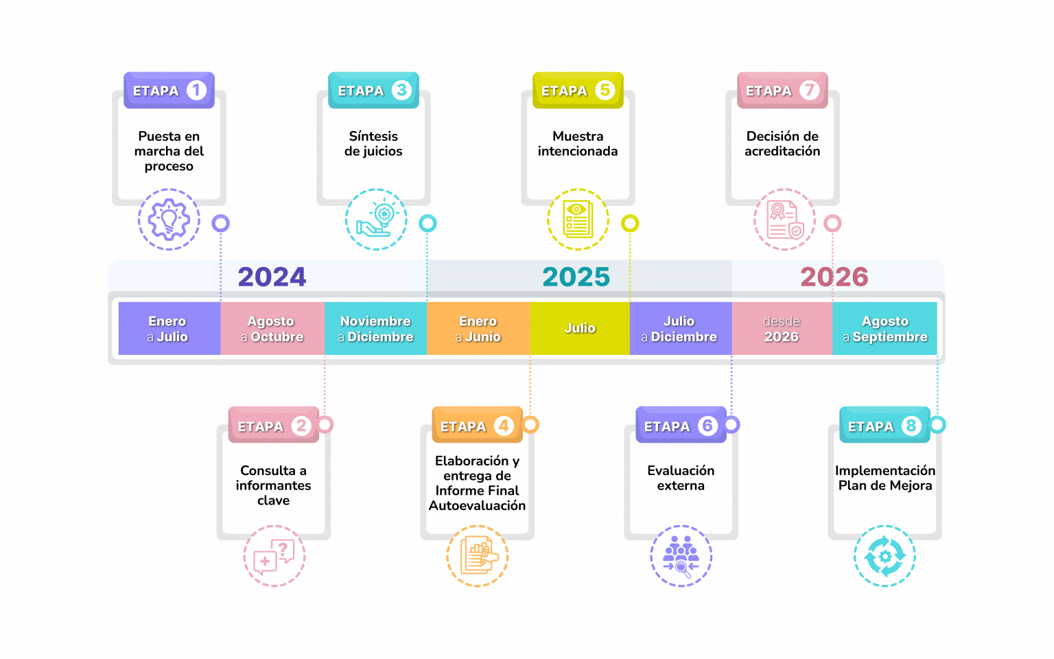 Se han establecido ocho etapas de trabajo que guían el desarrollo del proceso de Autoevaluación, tal como se detalla en el siguiente esquemas: