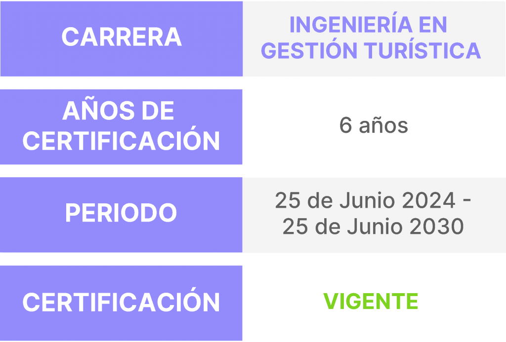 INGENIERÍA EN GESTIÓN TURÍSTICA | 6 años | 25 de Junio 2024 - | VIGENTE |