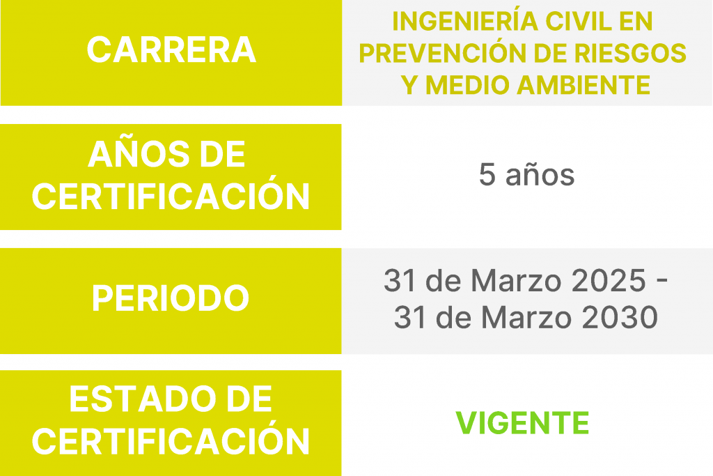 INGENIERÍA CIVIL EN PREVENCIÓN DE RIESGOS Y MEDIO AMBIENTE | 5 años | 31 de Marzo 2025 - 31 de Marzo 2030 | VIGENTE |