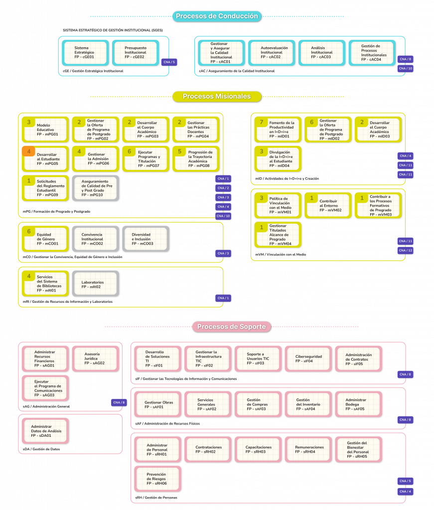 Cada proceso se compone de una secuencia lógica de acciones diseñadas para alcanzar objetivos específicos, enmarcadas en la normativa institucional y los criterios y estándares de calidad establecidos por la CNA-Chile.